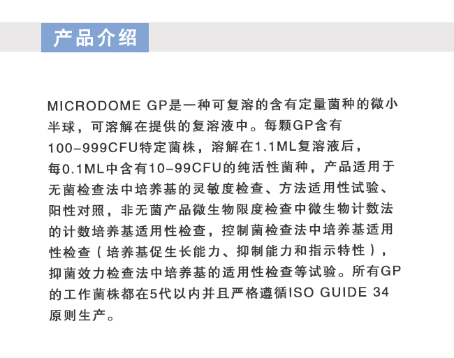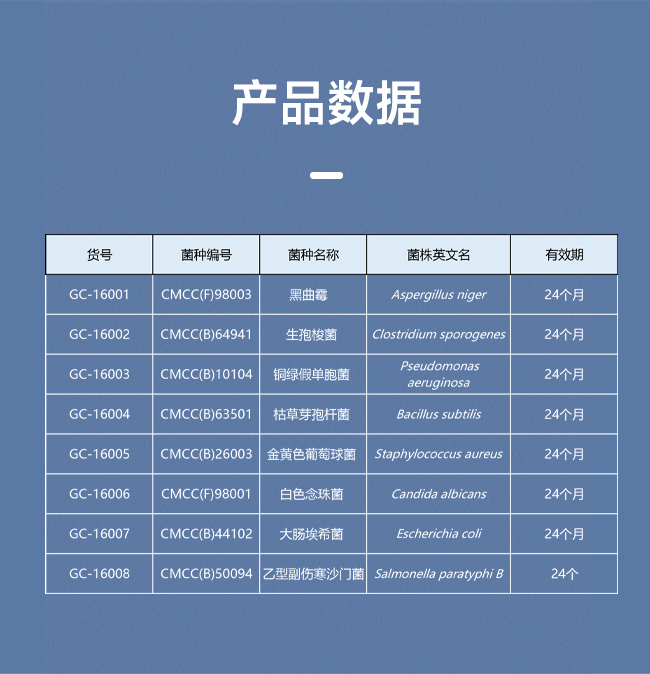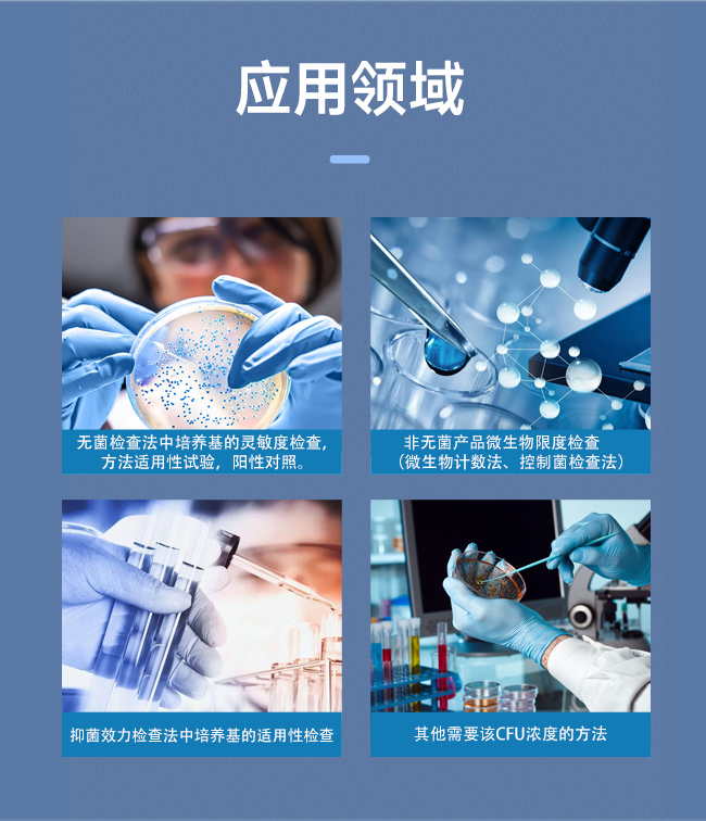 它适用于微生物实验室中培养基质量检查,微生物方法学适用性验证,抑菌效力认证以及阳性对照等试验。