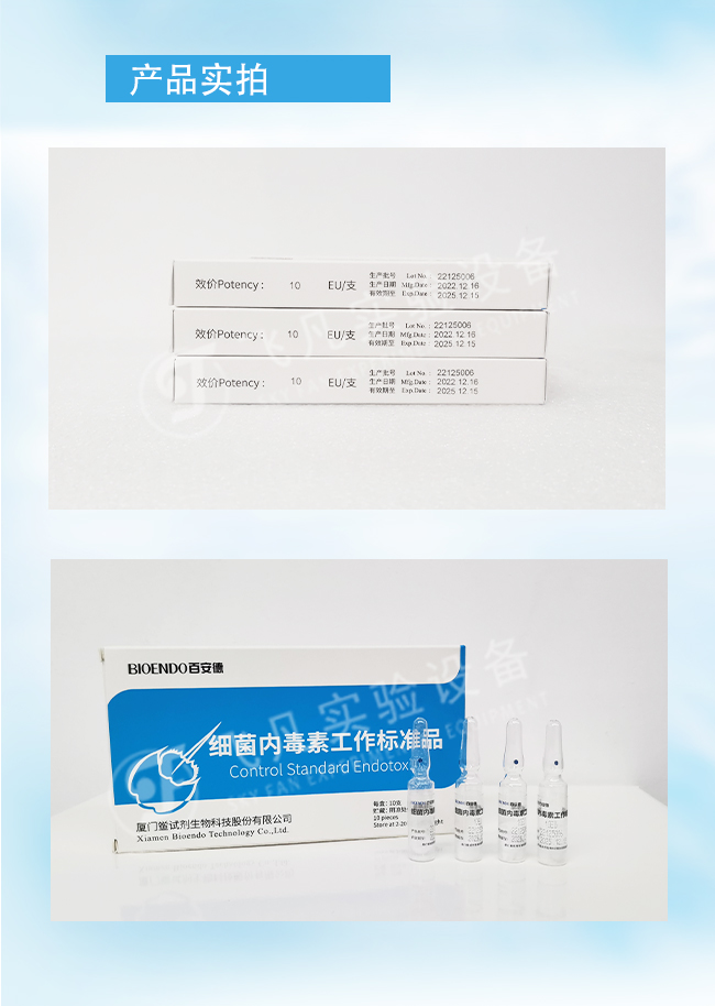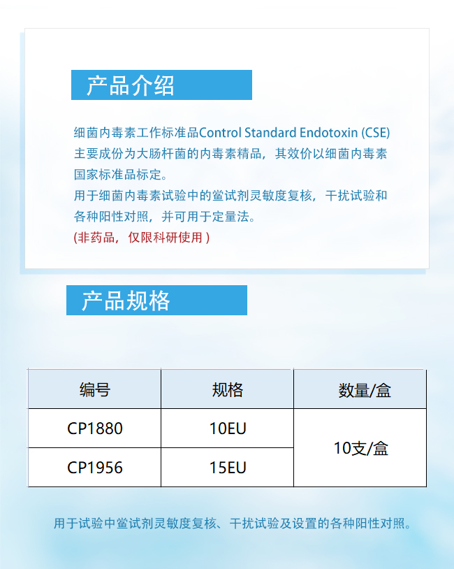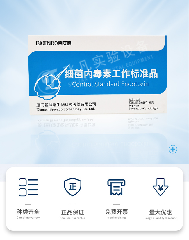 用于细菌内毒素试验中的鲎试剂灵敏度复核,干扰试验和各种阳性对照,并可用于定量法。