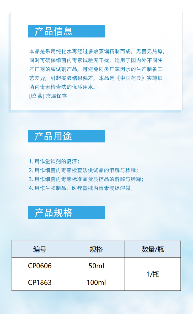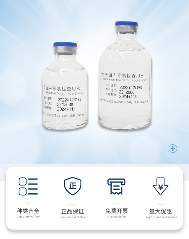 用作鲎试剂的复溶;用作细菌内毒素检查法供试品的溶解与稀释;用作细菌内毒素标准品货质控品的溶解与稀释;用作生物制品、医疗器械内毒素浸提溶媒。