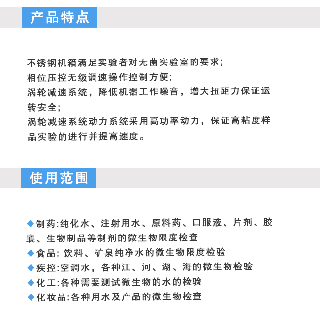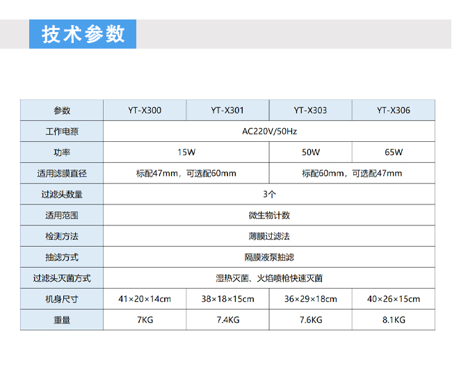 过滤头3个,抽滤方式隔膜液泵抽滤,适用滤膜47mm,适用范围微生物计数法