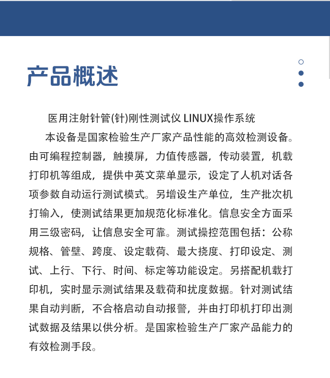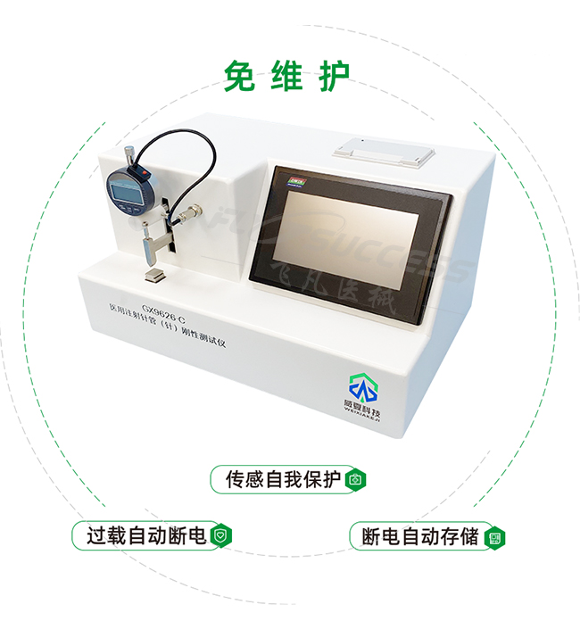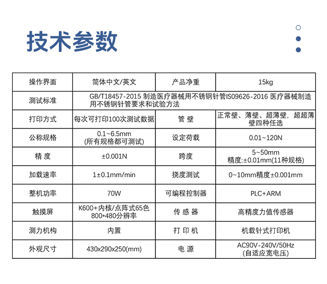 测试标准:GB/T18457-2015 制造医疗器械用不锈钢针管 ISO9626-2016 医疗器械制造用不锈钢针管要求和试验方法 管 壁:正常壁、薄壁、超薄壁,超超薄壁四种任选; 公称规格:0.1~6.5mm(所有规格都可测试); 设定荷载:0.01~120N, 精 度:±0.001N; 加载速率:1±0.1mm/min; 跨 度:5~50mm, 精度:±0.01mm(11种规格); 挠度测试:0~10mm, 精度:±0.001mm