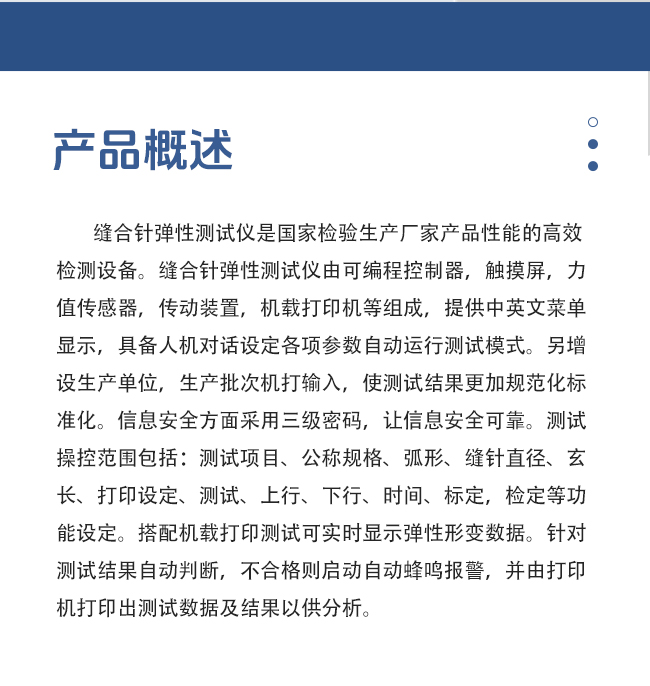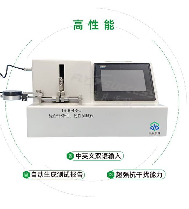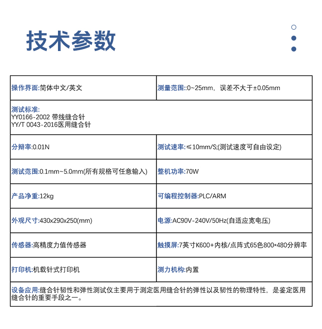 测试标准:YY0166-2002 带线缝合针 YY/T 0043-2016医用缝合针 测量玄长范围:0.1mm≤L≤80mm; 测试变形量范围:0~25mm,误差不大于±0.05mm,分辨率0.01mm; 测试速率:≤0.098N/S;(测试速度可软件设定) 测试针体直径范围:0.1mm~5.0mm、所有规格可任意输入。 产品净重:12kg