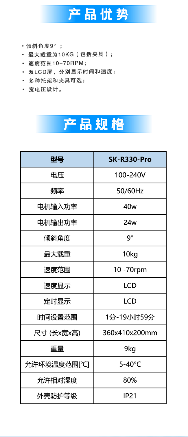 倾斜角度 9°,最大载重 10kg,速度范围 10 -70rpm,电机输入功率40w,时间设置范围 1分-19小时59分