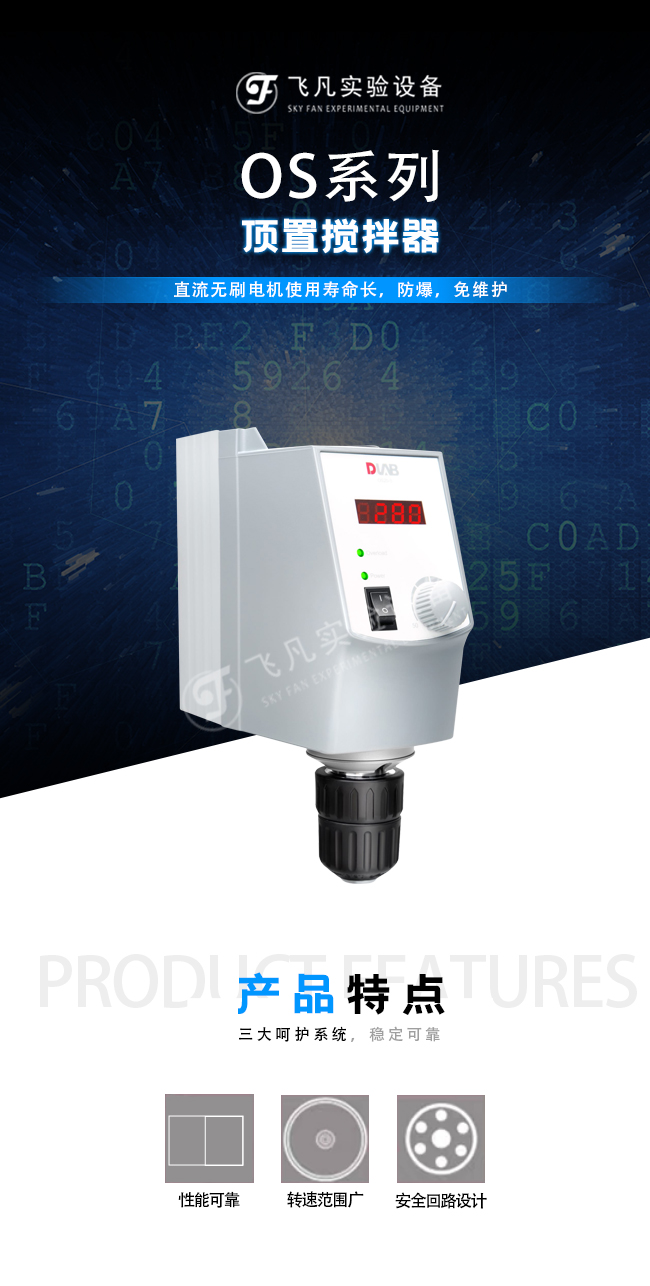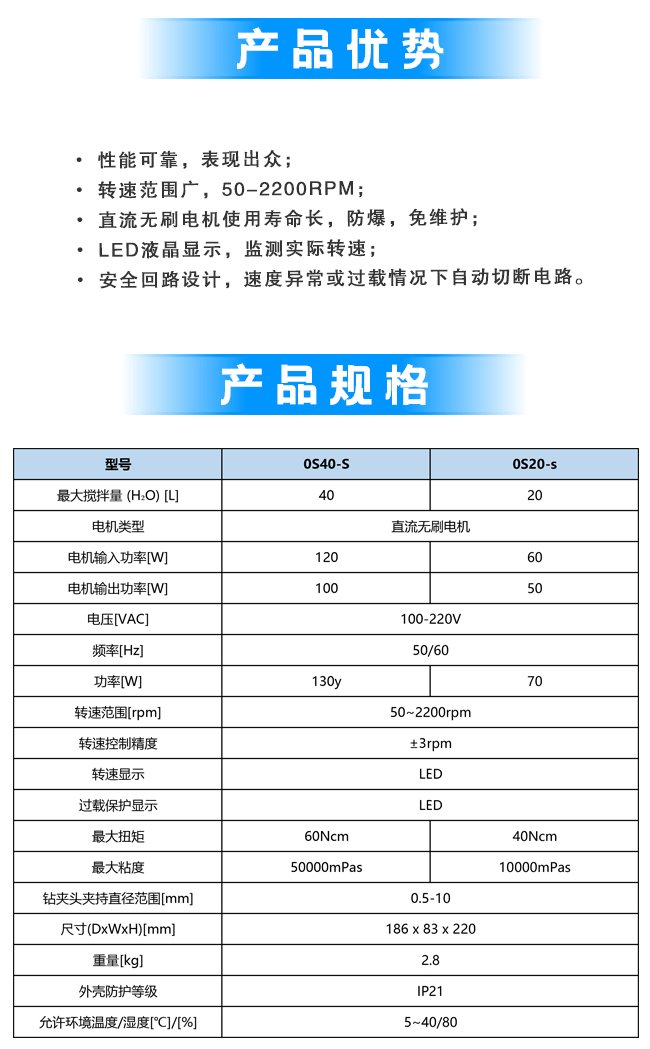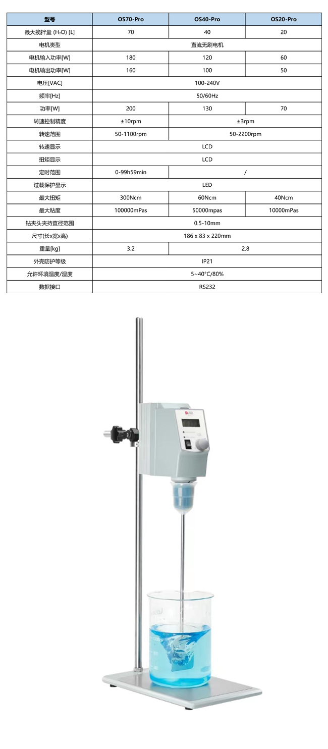 最大搅拌量(H2O)20L,转速范围50-2200rpm,最大扭矩40Ncm,最大粘度10000mPas,钻夹头夹持直径范围 0.5-10mm,功率 70W
