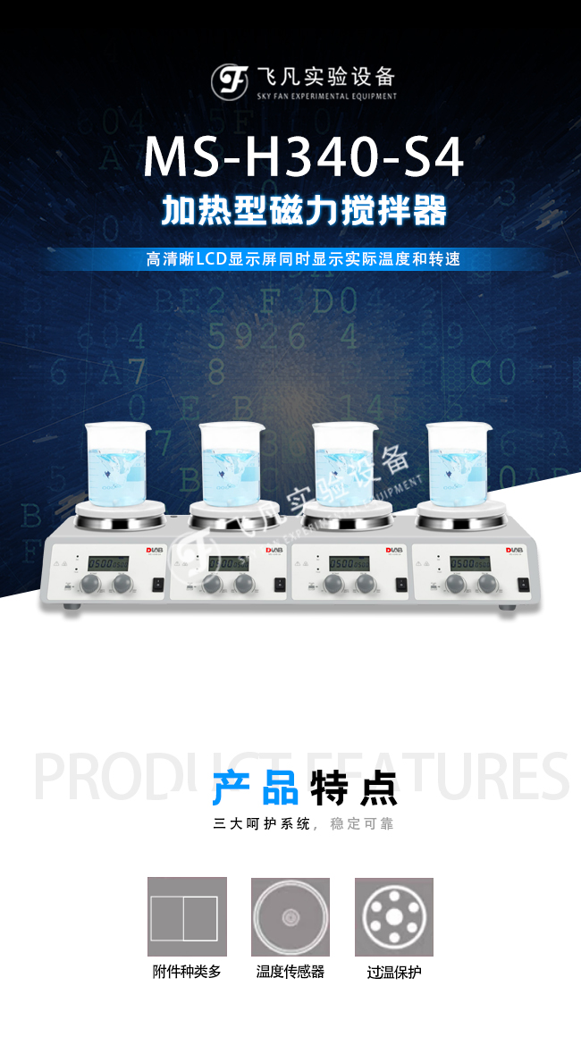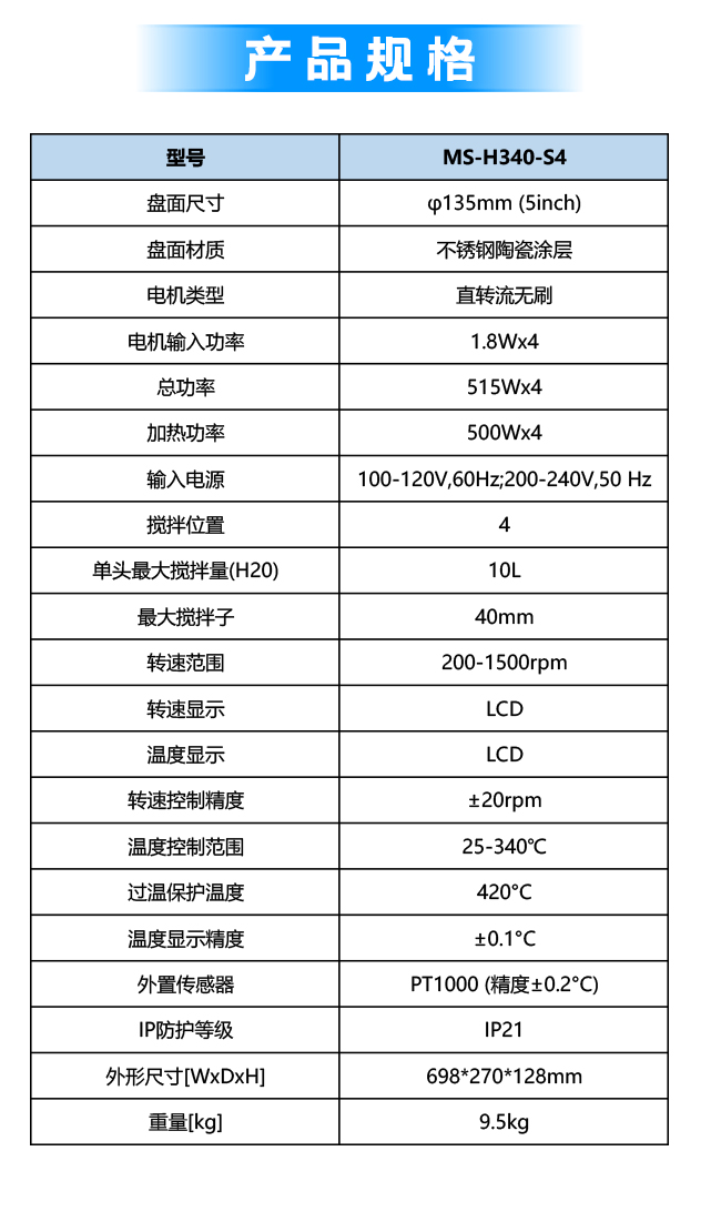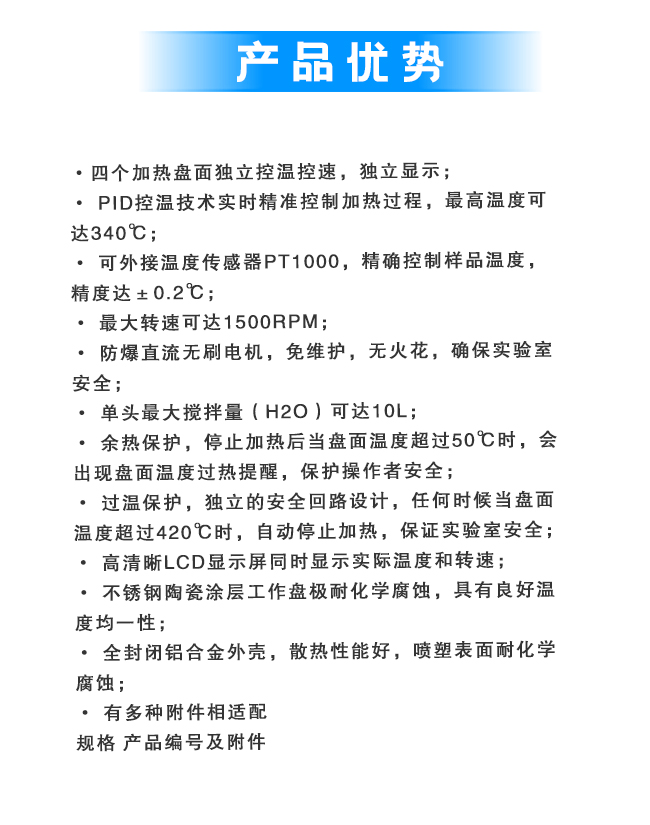 搅拌位置4,单头最大搅拌量(H2O)10L,转速范围200-1500rpm,温度控制范围25-340℃,总功率515W×4